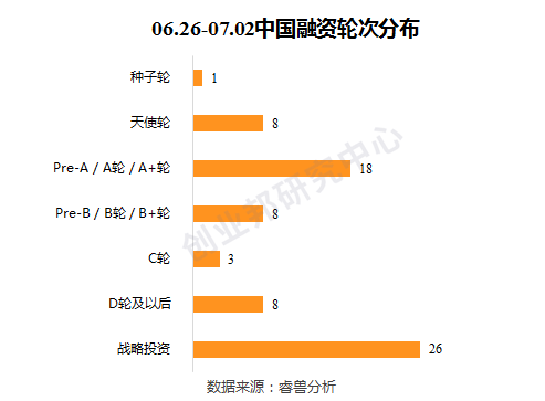 本周融资事件的融资轮次主要集中在前期(种子轮、天使轮、A轮),共27起,其中A轮有18起;中后期(B轮、C轮、D轮及以后)共19起;战略投资本周有26起。