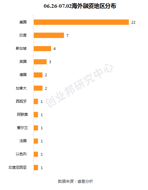 本周海外融资事件的融资轮次分布主要集中在前期(种子轮、天使轮、A轮)有22起;中后期(B轮、C轮、D轮及以后)有11起;战略投资本周有13起。