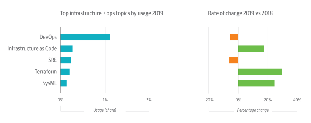 图注:O’Reilly 在线学习平台上的基础设施和运维主题 - 在 2019 年使用率由高至低的排序(左),以及每个主题的变化率(右)。