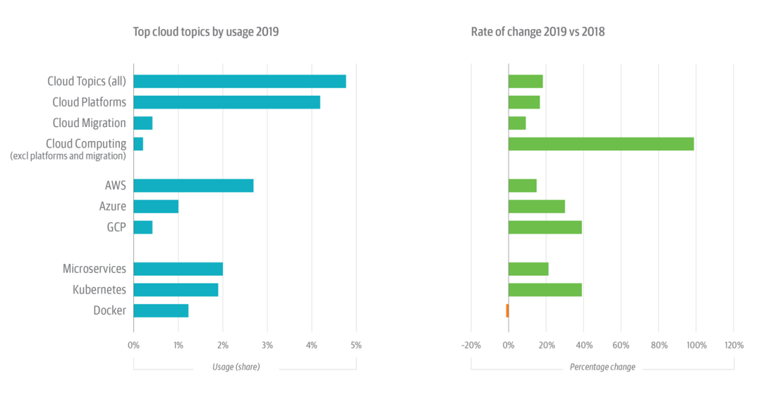 云依旧热门,云迁移成为新亮点。云平台的强劲使用率(+16%)为云相关主题贡献了大部分增长。值得关注的是,人们对云迁移主题的兴趣不断提升(2019 年使用率增长了 10%,而 2018 年增长了 30%),使其成为另一个重要的新兴趋势。