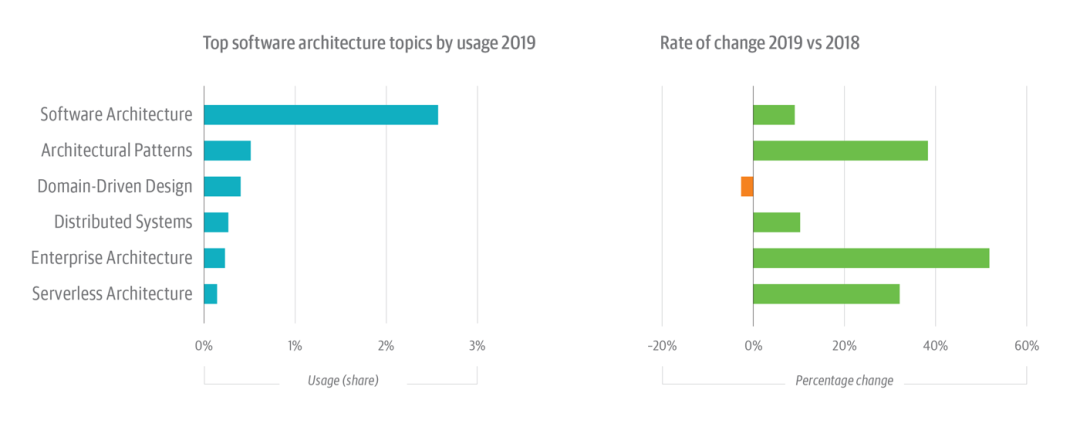 图注:O’Reilly 在线学习平台上的软件架构主题 - 在 2019 年使用率由高至低的排序(左),以及每个主题的变化率(右)。