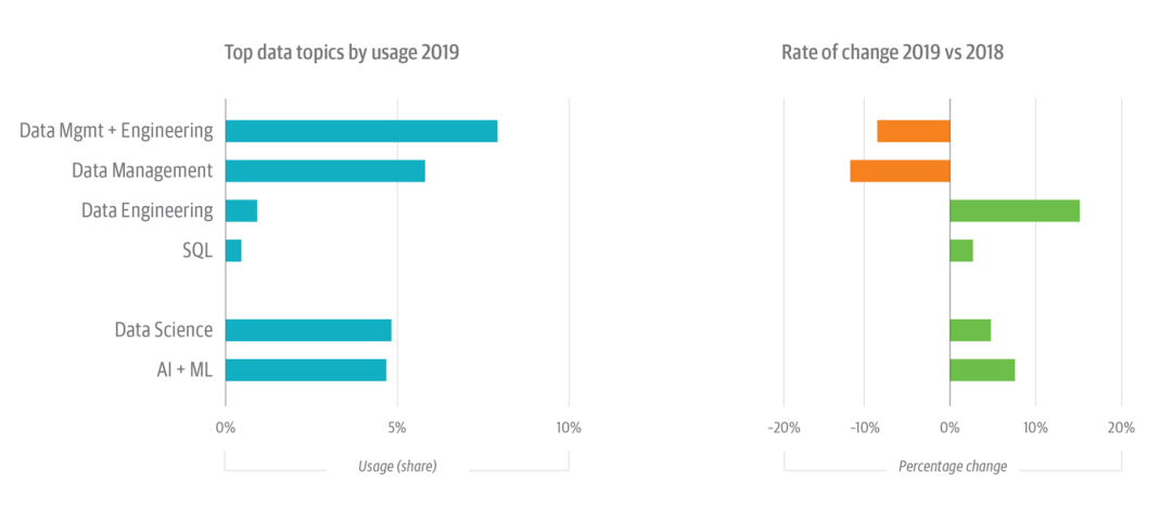在宏观层面的“数据”主题中,数据工程(包括数据管理)仍在该主题中占有最大份额,在平台上的所有使用率中占约十二分之一的份额。这几乎是数据科学主题份额的两倍,后者的使用率在 2018 年下降了(-2%)之后,在 2019 年恢复增长(+5%)。