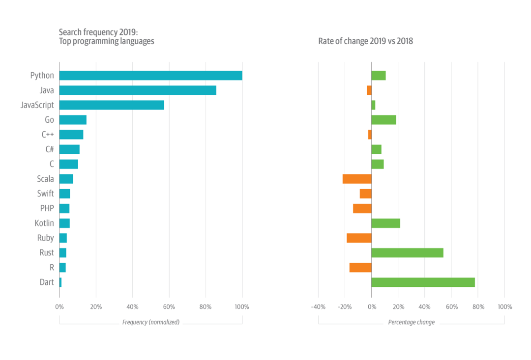 图注:O’Reilly 在线学习平台上的顶级编程语言在 2019 年的标准化搜索频率(左)以及每种语言的变化率(右)。
