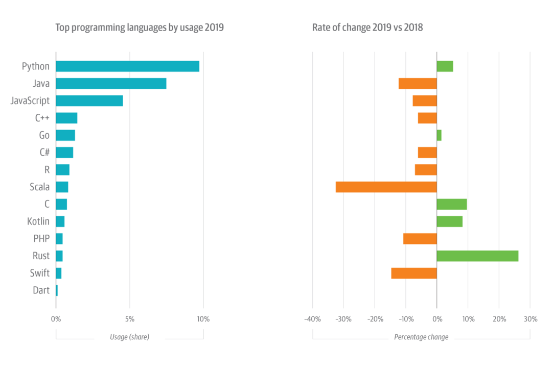 图注:在 O’Reilly 在线学习平台上的编程语言 - 在 2019 年使用率由高至低的排序(左),以及每种语言的变化率(右)。