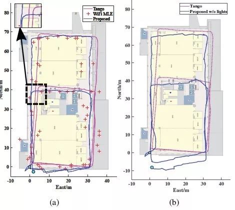 图4:用(a)和没有(b)光测量的定位结果的图示。 测试步行来自左下角,方形标记起点,圆圈标记端点。