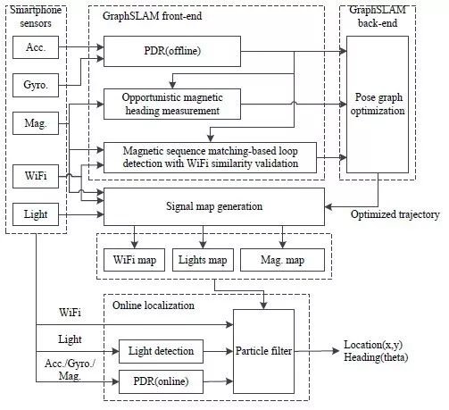 在过去十年里,关于行人室内导航的研究日益成为研究热点。该文章提出了一种低成本的室内建图和定位解决方案,本文提出了一种低成本的基于室内环境信和智能手机传感器信息的室内建图和定位方案。改解决方案由基于GraphSLAM的离线建图和基于贝叶斯滤波的在线定位组成。GraphSLAM前端由行人航位推算(PDR)的运动约束构成,通过磁序列和WiFi信号相似性的匹配验证回环约束。而排除误差后的机会磁力形成观测约束。通过图优化创建全局一致的轨迹,之后通过高斯过程回归(GPR)生成 信号图(例如,WiFi,磁场,光)以用于后续的定位。文章建议使用来自磁场的GPR方差图的伪墙约束和光测量作为粒子滤波的观测。所提出的方法在若干个数据集上进行了评估,这些数据集采集于办公楼和外部公共区域环境。在办公楼内的定位会实时显示在智能手机上,建筑物覆盖2000平方米,50%和90%的精度分别是2.30米和3.41米。