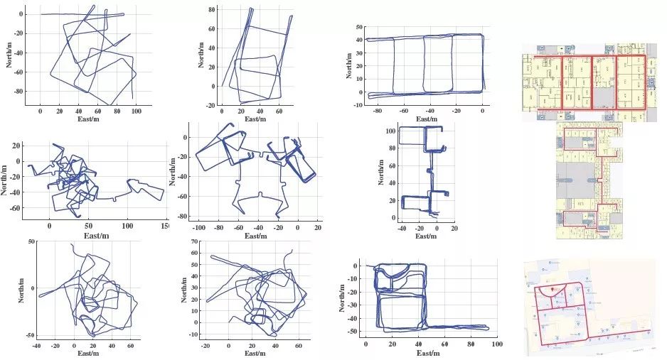 图3 从上到下:AC3-2,AC4-1和SOGO。 从左到右:1)优化前的原始PDR导出轨迹,2)优化轨迹而不包含磁航向测量,3)通过所提出方法的最终优化轨迹,以及4)图规划上的参考路径。 平面图仅用于本文的视觉化。