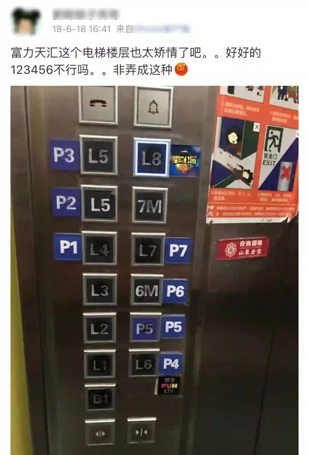 先不说外面的没什么规律的扶梯,单说宛如密室逃脱一般的升降梯。首先电梯标识中包含了 M、L、P、B四种标志,让你眼花缭乱。