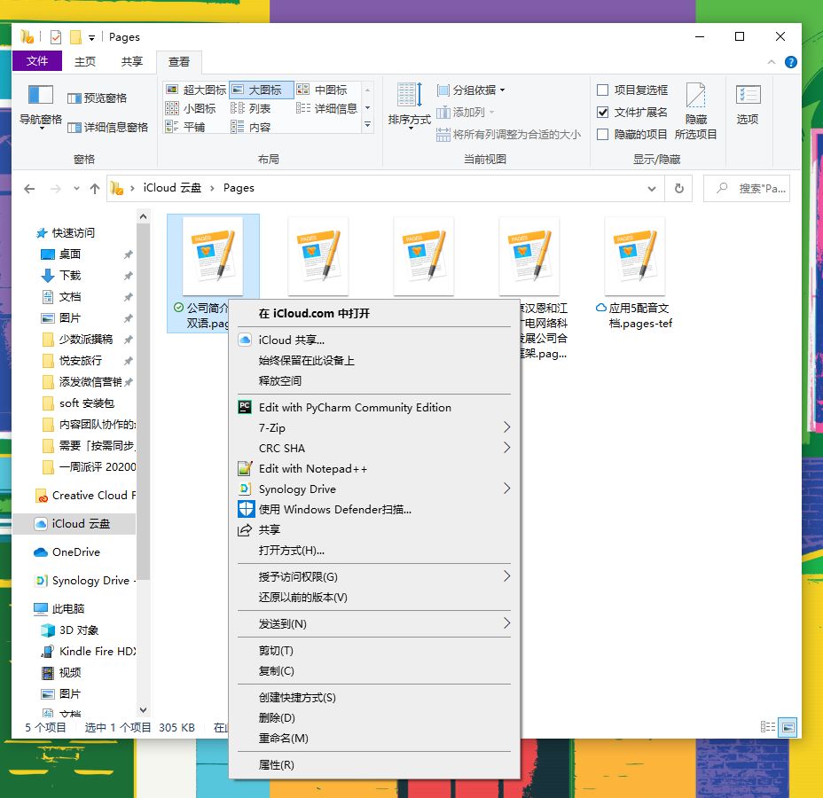 iCloud 已经深度整合到了 Apple 的生态系统当中,在 iPhone 上拍摄的照片、保存的邮件、创建的日历等等信息,都可以通过 iCloud 备份并同步到其它 Apple 设备上。而如果你因为自身或工作原因选择 Windows 作为办公设备,其实也可以通过 iCloud 获得不错的云端同步体验。除了查看拍摄的图片、保存的书签等等,iCloud for Windows 同样也支持按需同步功能。iCloud for Windows在 Windows Store 中安装 iCloud 并登录后,我们就可以在 Windows 10 的资源管理器中看到 iCloud 的文件存储目录了。和上面介绍的云盘一样,我们可以用同样的角标样式来判断 iCloud 文件在 Windows 上的按需同步状态,因为基于 Windows 10 按需同步的原生支持,在 Windows 系统设置的存储感知功能中也可以看到 iCloud 云盘的相关设置项目。iCoud 文件目录值得一提的是使用 iCloud 云盘作为学习和办公文件中转一定得考虑到文档类型的问题,我们在其它 Apple 设备上编辑、保存的 iWork 文件在 Windows 系统上虽然没有原生的应用支持,但依然可以通过 iWork 网页版本进行查看和编辑。在 iCloud.com 中打开总体来看,Windows 版的 iCloud 在按需同步体验上也非常接近 OneDrive,虽然缺少一些原生应用支持,但通过 iCloud 网页版能够解决大都数基于 iWork 的学习和办公需求,非常适合 Apple 产品和服务的重度用户。要说缺点的话,iCloud 云盘免费版只有 5GB 存储空间,如果你有更大的空间需求则需要进行付费购买。