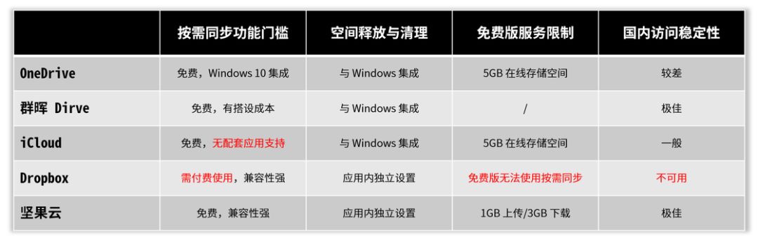 早期网盘的同步方式非常机械,为了摸清文件层级,我们往往需要将网盘云端目录中的大量数据统统下载到本地。这种全盘同步的方式不仅会在外出办公的过程中消耗不必要的网络流量,对当前市面上大部分存储空间并不充裕的轻薄办公设备而言也是一种奢侈的空间浪费。「按需同步」这一同步特性应运而生。顾名思义,按需同步可以根据我们的实际需要进行同步操作,所有文件修改、增添都会上传到云端,除了文件目录和列表,同步时并不会将所有数据下载到本地。只有需要使用某个文件时才会将其从云端下载到电脑上。这就大大节省了同步需要的网络流量和本地存储空间。按需同步可以帮助我们很方便地获取文件目录结构微软自 Windows 10 v1709 开始引入了按需同步特性并首先运用于自家的 OneDrive 之上,使用 OneDrive 同步时系统会首先同步文件列表,之后再根据用户的实际需求有选择性地下载云端文件到本地。配合 Windows 10 的存储空间管理机制,系统会在一段时间后自动释放已经离线但不再使用的文件,进一步节省本地存储空间。Windows 10 的存储感知功能可见支持按需同步的网盘有着其他传统网盘不可比拟的优势:一方面文件数据被放在了云端这个高可靠性的「保险柜」中(鸡蛋不要放在一个篮子里的原理),文件目录和层级则能在本地得到较好地保留,管理更加方便;另一方面进行文件同步时我们又可以根据进行下载,加快同步速度,节省本地存储空间。那我们都有哪些支持这一特性的网盘服务可以选择呢?
