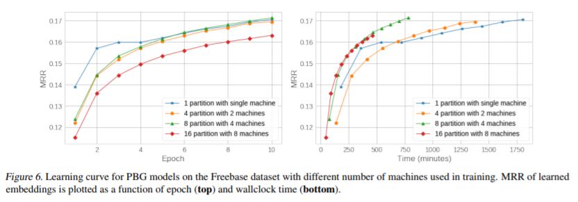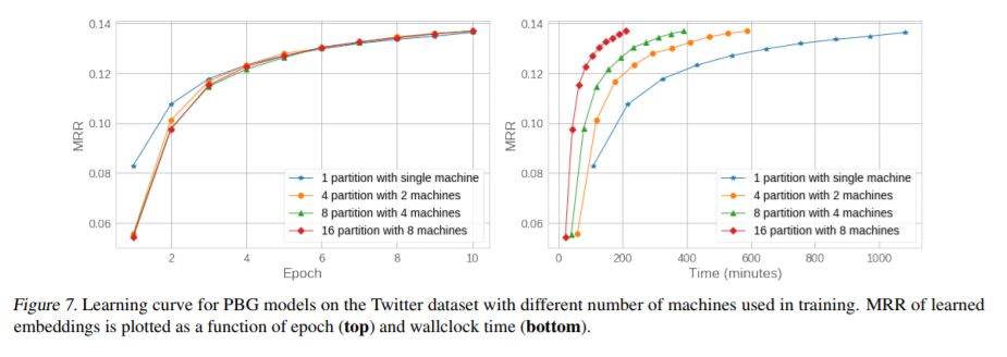 在图 7 中,我们报告了在训练过程中使用不同数量的机器获得的测试 MRR 学习曲线。与图 6 中的 Freebase 知识库学习曲线相比,Twitter 图显示了训练时间的线性比例,因为图是并行化分和训练的。