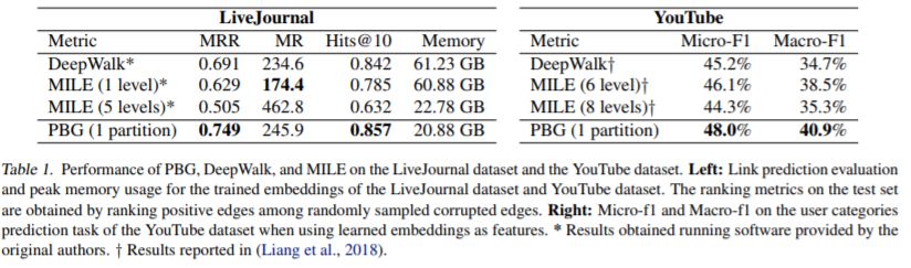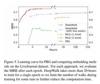 我们将 PBG 嵌入性能与 MILE 进行了比较,MILE 也可以扩展到大型图。MILE 反复地将图粗化为较少的图,并在每个级别的粗化图上应用传统的嵌入方法,最后进行细化,得到原始图的嵌入。文中还展示了基于 MILE 嵌入的 DeepWalk 的性能。
