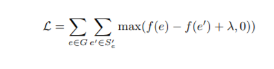 在多实体图中,负样本仅从边关系的正确实体类型中采样。因此,在我们的模型中,”无效“边(错误的实体类型)的分数是未定义的。以前在知识图的上下文中已经研究过使用实体类型的方法,但是我们发现在节点数高度不平衡的情况下,拥有实体类型的图中特别重要,例如,10 亿用户 vs100 万产品。在所有节点上采用统一的负采样,损失将由用户负样本节点来控制,并且不会优化用户 - 产品边之间的排名。PBG 优化了训练数据中每个边 e 和一组边 e 之间基于边缘(margin-based)的排序目标函数,这些边 e 是通过破坏(corrupt)被采样的源或目标节点(不能同时使用)来构造的。