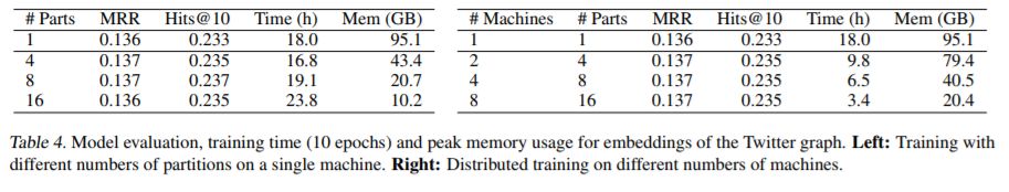 在表 4 中,我们报告了 10 个训练周期后的 MRR 和 Top10 命中(Hits@10), 以及不同分区和并行模式的训练时间和峰值内存使用情况。结果与表 3 一致:我们观察到多台机器的训练时间减少,而没有损失链接预测精度的情况下。