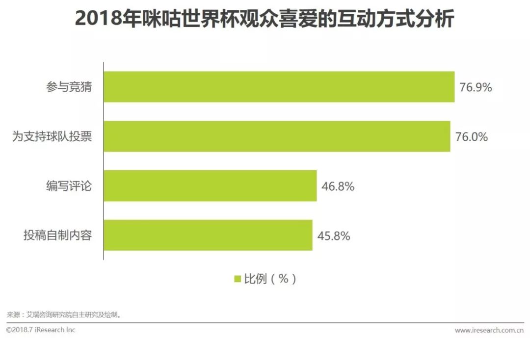 在本届世界杯期间,观众除了观看比赛之外,还通过多种多样有趣的方式加入与世界杯有关的互动。在各互动方式中,参与比赛胜负的竞猜成为最受观众欢迎的互动方式。同时球迷也通过投票的方式pick自己喜欢的球队。