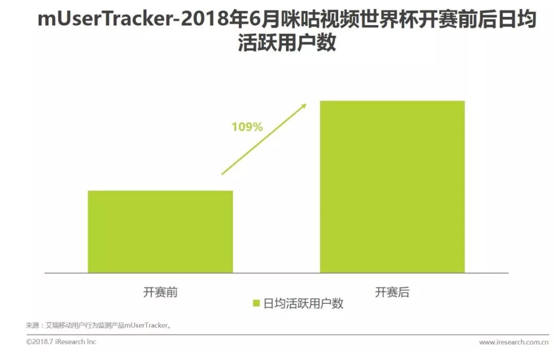 在获得世界杯的转播权之后,各大视频平台纷纷发挥自身优势,为观众全天候的提供世界杯相关的精彩内容。因版权利好的原因,咪咕视频用户在大赛开始后的增长速度令人侧目。在世界杯开赛当日,咪咕视频的日活跃用户较月初增长了109%。