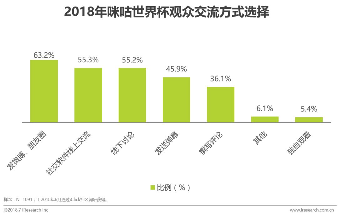 在线下与同伴、支持同一球队的球迷一起观看比赛的同时,越来越多的观众选择在社交平台上同时分享自己观赛的实时感受。在世界杯观众中,会通过发微博、朋友圈分享自己对比赛看法的人占63.2%。