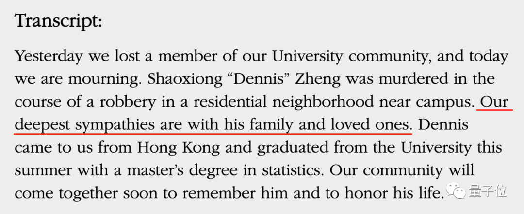 随后,芝加哥大学校长Paul Alivisatos对郑同学的不幸离世表示哀悼。