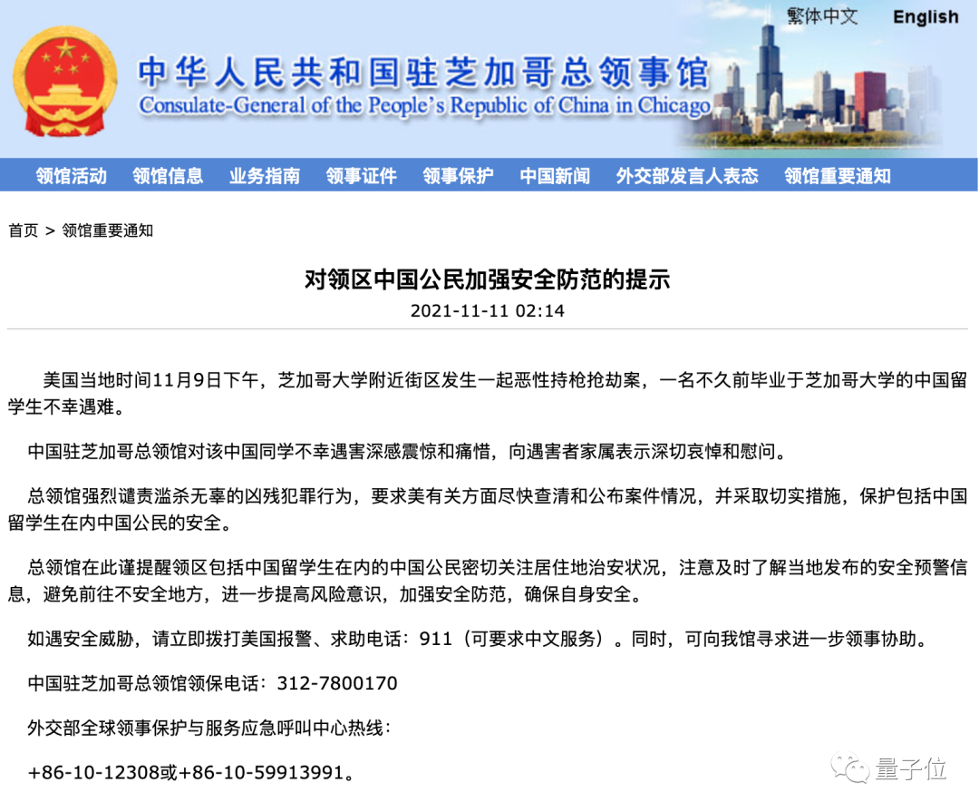 对此,驻芝加哥总领事馆也提醒中国留学生在内的中国公民,密切关注居住地治安情况,如果遇到安全威胁,请立即拨打美国报警、求助电话,同时可向领事馆寻求进一步协助。