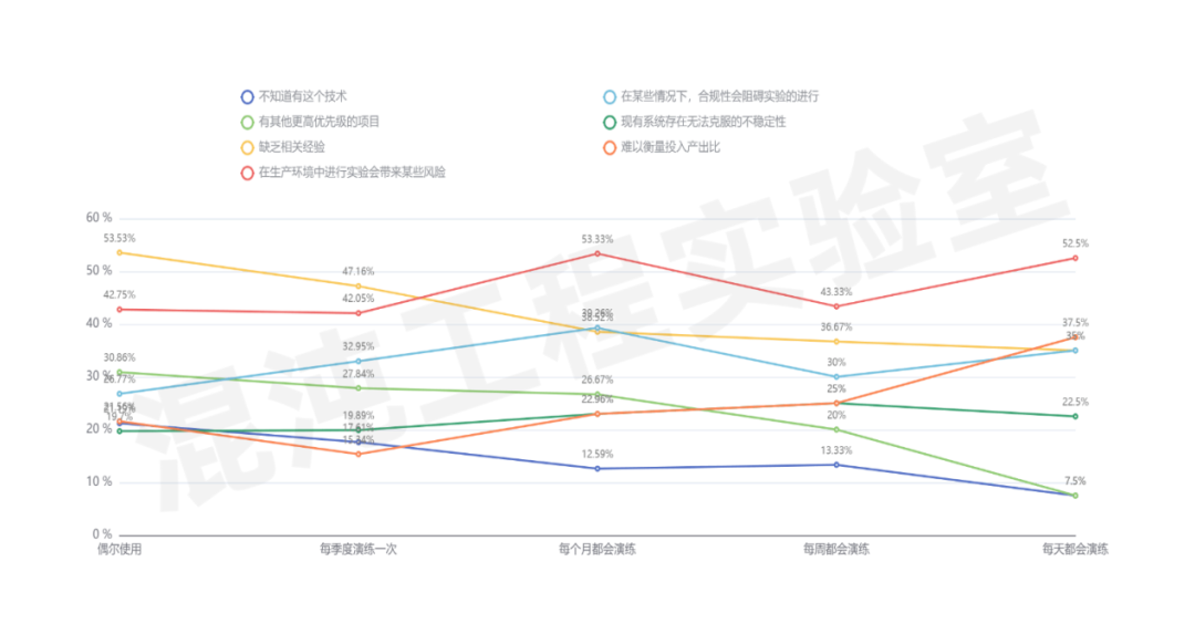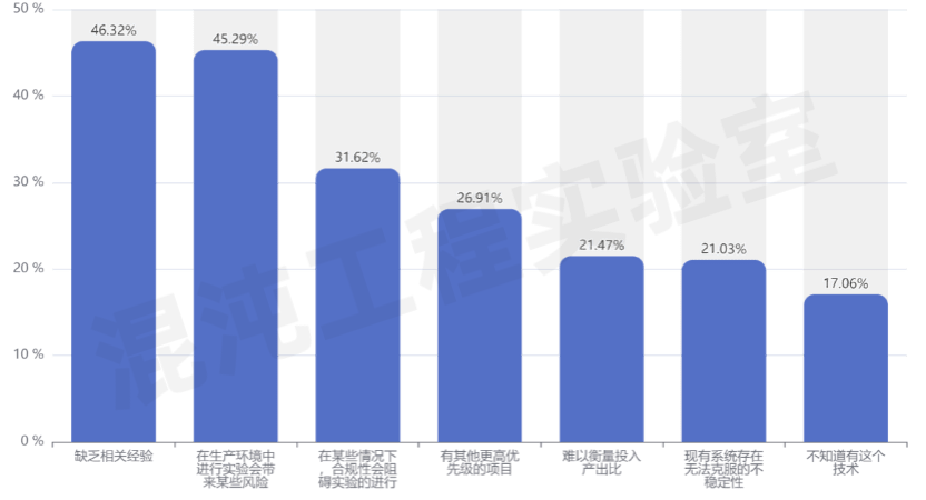 阻碍用户大规模、深度使用混沌工程的主要障碍是:缺乏相关经验以及担心故障注入对生产环境带来风险。