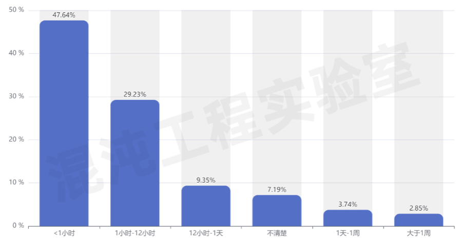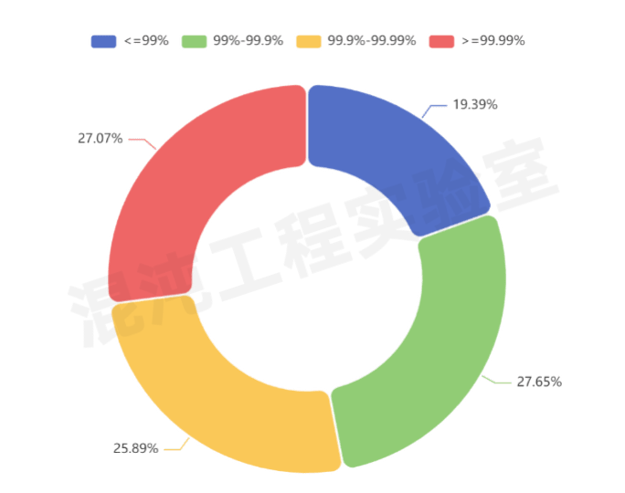 1)调查数据显示,近 20% 的受访用户所负责的产品可用性低于 2 个 9,近半数产品的可用性能低于 3 个 9。这意味着 47.04% 的用户每个月要忍受高于 44 分钟(可用性 99.9%),甚至超过 7.3 小时(可用性 99%)的服务故障。