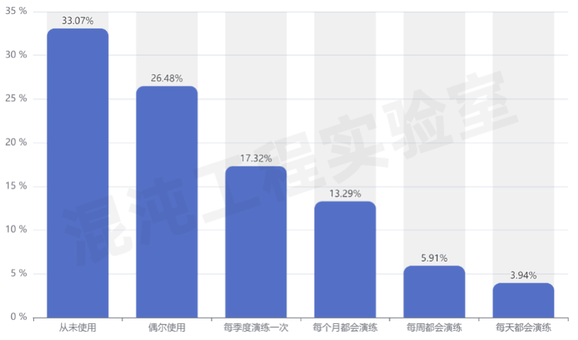 1)混沌工程普及率较低,未来有广阔增长空间:受访用户中有超过 3 成从未使用过混沌工程,仅 3.94% 左右的能比较频繁地(每天演练)使用混沌工程。