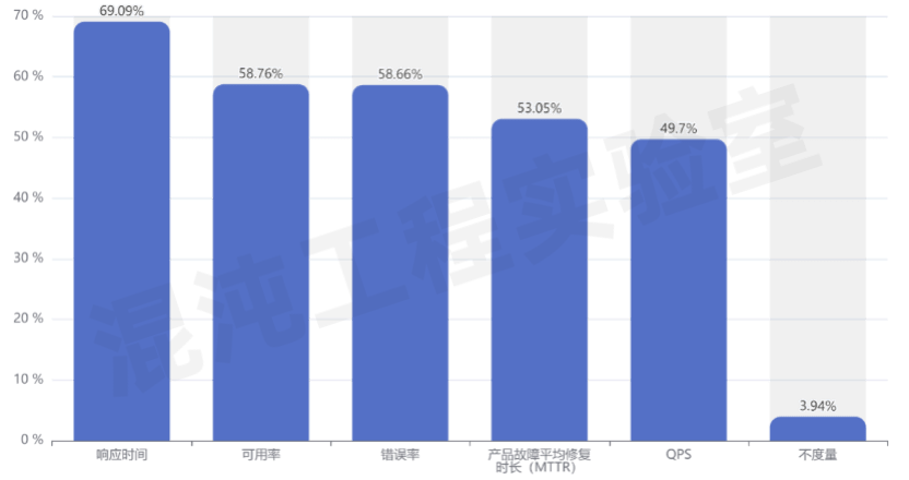 1)产品可用性度量维度多样:响应时间、可用率和错误率的选择人数明显较高,是度量产品可用性时最常使用的指标。有近 70% 的用户采用响应时间作为产品可用性度量标准之一,除此之外,可用率和错误率的选择人数也接近 60%。