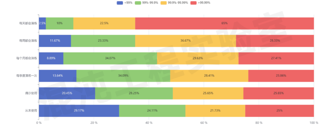 从未使用过混沌工程的受访者中,有近三成受访者产品可用性低于 99%,而随着混沌工程使用频率提升,在每天都会演练的受访者中,这一比例急剧缩减到 2.5%(见下图中蓝色模块),即随着混沌工程使用频率提升,低可用性的产品占比急剧萎缩;与此相对应的是,从未使用过混沌工程的受访者中,仅 25% 的产品可用性高于 99.99%,而随着混沌工程使用频率提升,在每天都会演练的受访者中,这一比例迅速增长至 65%(见下图中红色模块),即随着混沌工程使用频率提升,高可用性的产品占比迅速增长。