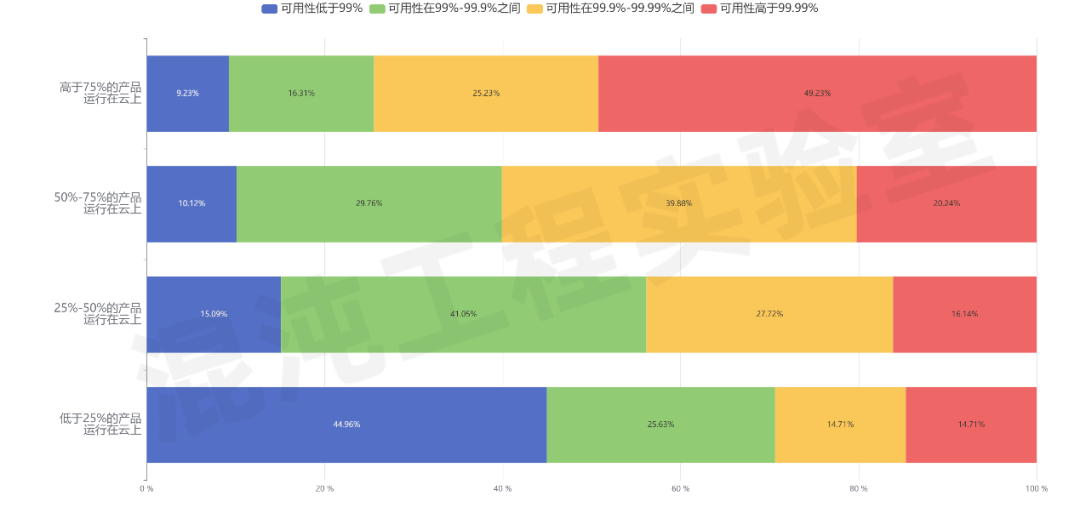 3)应用上云是提升可用性的有效手段:从公司的云化程度来看,不同的云化程度对产品可用性的影响具有显著差异,云化程度越高的公司,产品可用性越高。上云比例低于 25% 的公司中,44.96% 的产品可用性低于 99%,仅 14.71% 的产品可用性高于 99.99%;而随着上云产品比例的提升至 75% 以上后,可用性高于 99.99% 的产品占比急速飙升至 49.23%,翻了两番之多。