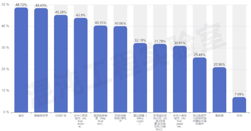 2)产品可用性的提升方式:备份、健康性检查、自动扩容、多中心双活模式、数据库复制集调查数据显示,48.72% 的用户会选择使用“备份”作为提升产品可用性的方法,48.43% 的用户会选择使用“健康性检查”,而自动扩容以 45.28% 的比例跻身产品可用性提升方法的第三位,多中心双活和数据库复制集分别以 43.9% 和 40.06% 的占比分列四、五位。相关人员可参考此数据以指导产品可用性提升建设规划。