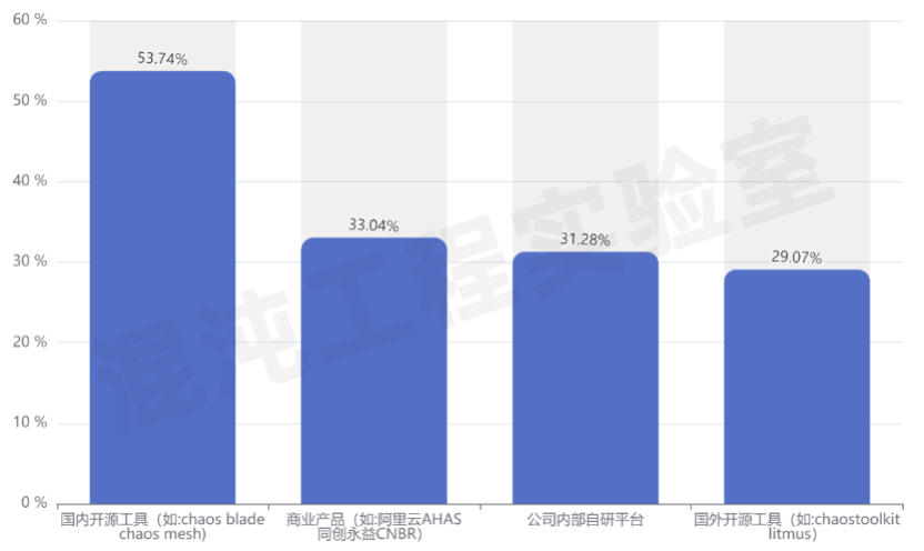 近半数企业在研发、测试环境中使用混沌工程,仅不到 20% 的企业在生产环境中开展混沌工程演练,混沌工程在内部使用的技术复杂度不够高;