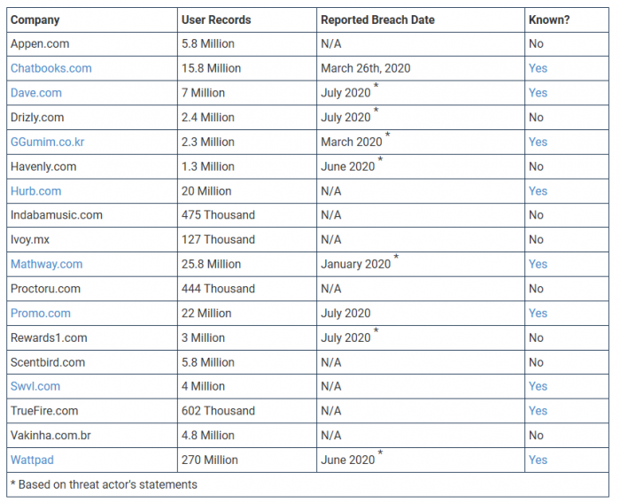 在 7 月 21 日以来发布的数据库中,其中 9 个数据库在过去已经以某种方式被披露,另外 9 个此前并未披露。18 起数据泄露事件的完整名单如下: