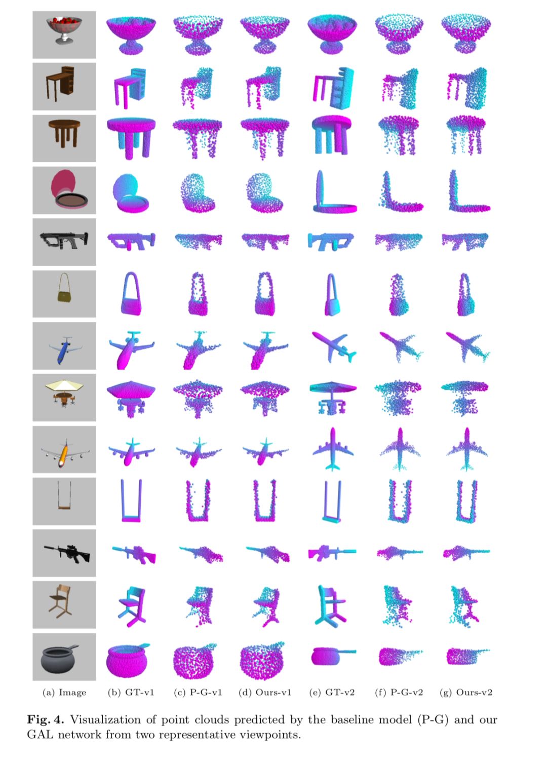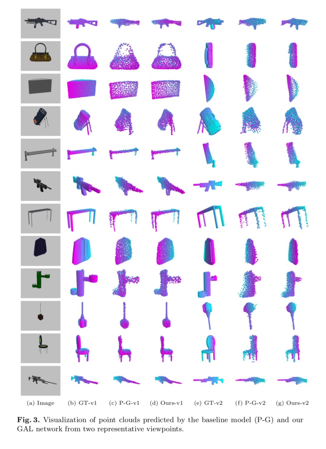 在本文中我们提出了一种补充的损失函数——几何对抗损失来解决这个问题。几何对抗损失通过保持预测点云和真实点云在不同 2D 视角上的几何一致性来从整体上规范生成的点云,同时它要求生成的点云与输入图片的语义相符。