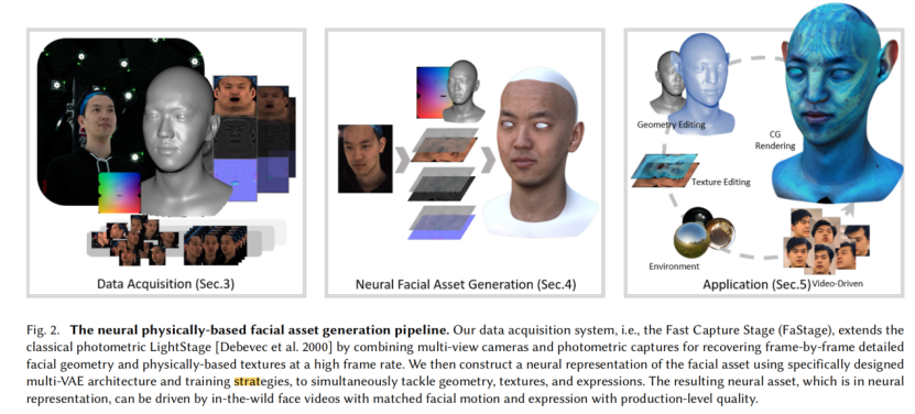 首先是训练数据采集。研究人员使用了穹顶光场设备采集演员的面部资产。模特按照研究人员的设计进行面部表演,由穹顶光场以 24fps 采集了模特表演的动态面部几何和材质贴图(漫反射、高光、法线贴图)。