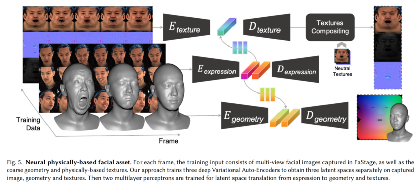 最后使用时,对于某一视频输入帧,由表情 VAE 的编码器提取表情信息,由两个 MLP 分别将其转化为几何、材质贴图 VAE 的表情隐向量,再由两个 VAE 的解码器得到对应的几何和材质贴图。