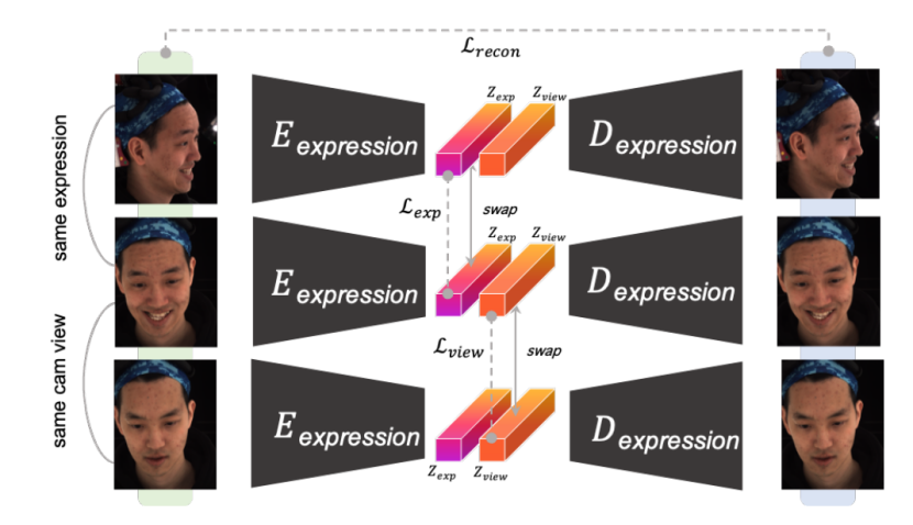 在训练表情网络时,他们使用了全新的三元训练法来监督训练。训练时,将某张图片与其相同视角不同表情的照片,以及不同视角相同表情的照片分在一组,使得网络能够学会从输入视频帧中解耦表情与视角信息,从而在视角变换的情况下也能稳定地以隐向量形式提取出表情信息。
