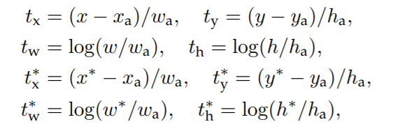 其中,x,y,w,h是Bounding Box的中心坐标和宽高;而 则分别对应Predicated BBox、Anchor BBox和Ground Truth BBox;y,w,h也同理。