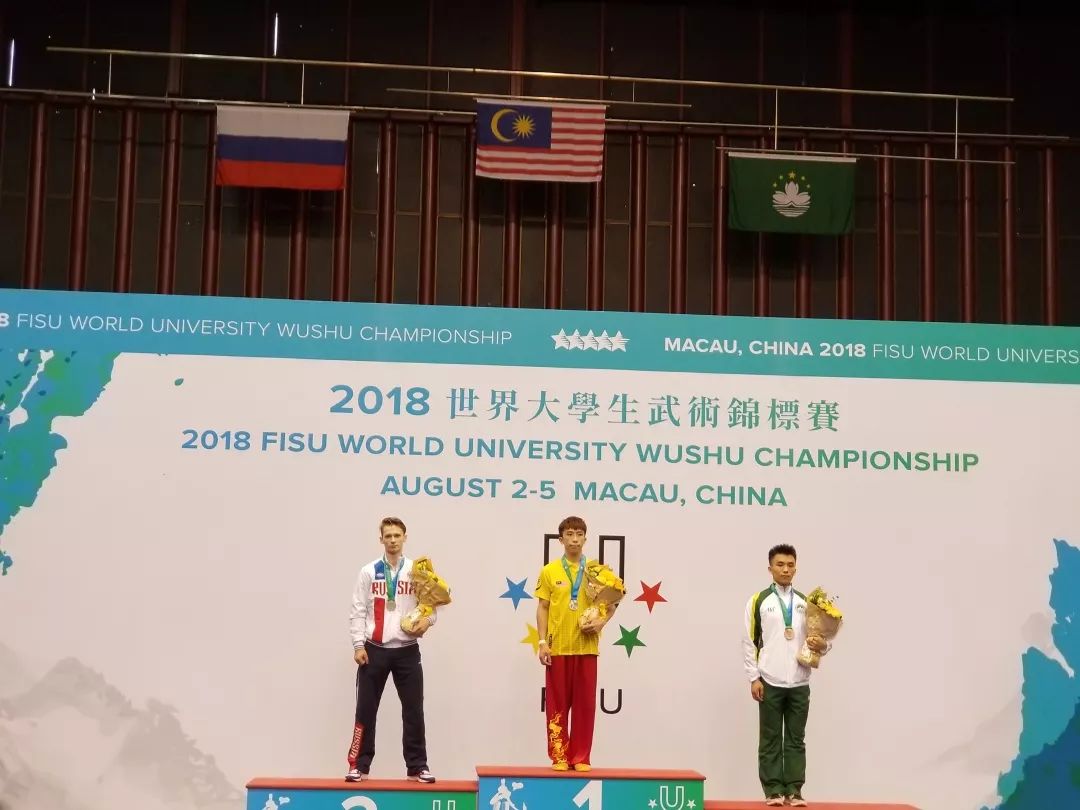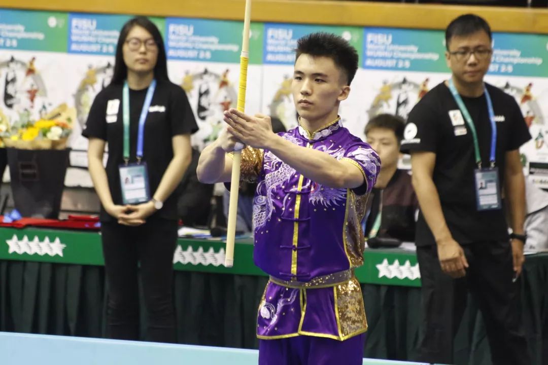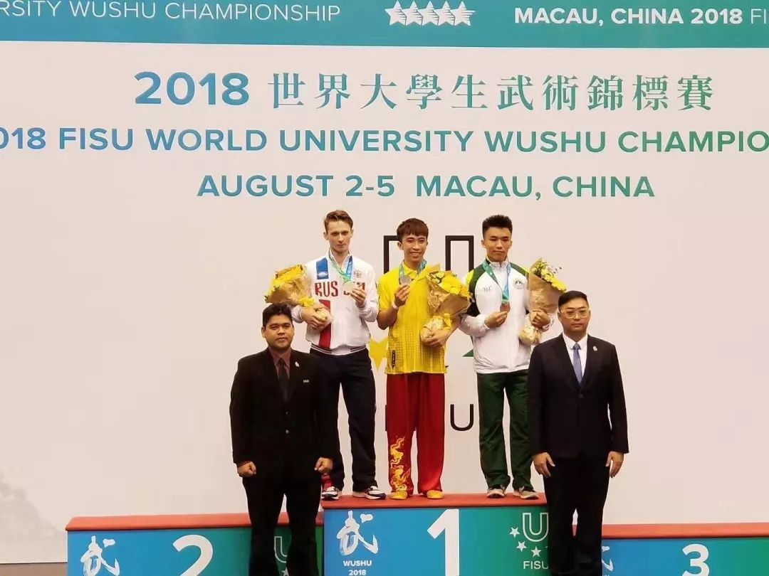 8月5日,2018首届世界大学生武术锦标赛最后一天,男子棍术,12位选手,第七位;1分20秒,拨、扫、抡、戳、劈、舞花,身随棍动,精到毫厘,中国澳门队选手CHEONG Wai Seng,最终以9.32分获得季军,也就是来自南京大学历史学院的16级本科生蒋伟城。