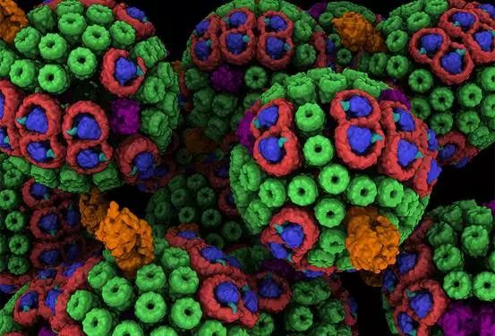 光合细菌(紫色)的内部含有数百个称为色素细胞的光合细胞器。这张沉浸式的图像是在VMD中创建的,通过将模拟的球形色素团放入一个紫色细菌的电子显微镜断层图中,捕捉到蛋白质的机械结构,这些蛋白质通过吸收阳光来产生ATP。这张图片在生物物理学会2019年科学艺术图片大赛中获得了第一名。