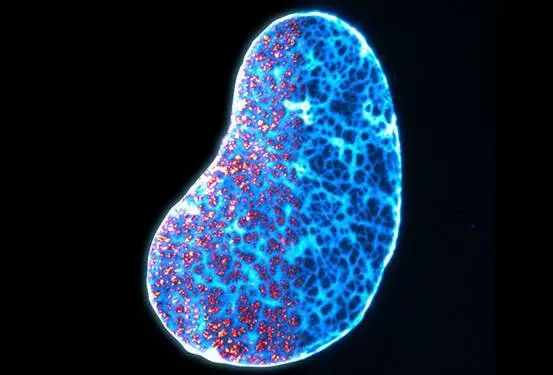 HeLa细胞的Lamin A网络(青色)和核孔(橙色)在空间上表现出反定位关系。这张照片是用扩增显微镜拍摄的。HeLa细胞过表达的Lamin A与SNAP-tag融合,采用抗nup153对核孔进行免疫染色。