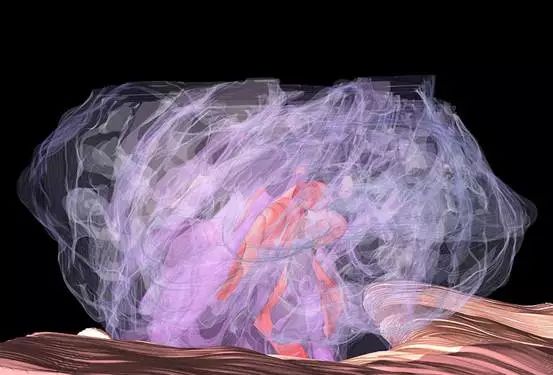 利用系列块面扫描电镜技术观察到来自小鼠的血凝块的完整3D渲染。这种血栓显示跨越穿刺的颈静脉(粉红色)的红细胞(红色)周围的血小板聚集情况(紫色)。