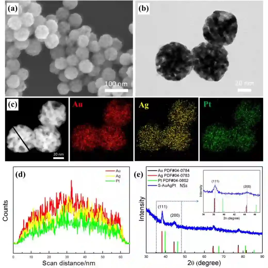 中国科学院合肥物质科学研究院固体物理研究所李越研究员团队采用激光诱导法成功制备出三维多孔金银铂三元合金纳米材料催化剂(spongy AuAgPt NSs),如图4,5所示。