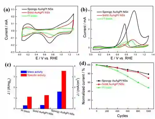 由于多孔结构以及高指数晶面、晶格扭曲和孪晶界的存在,使其具有大的比表面积和高密度活性位点。该催化剂不仅稳定性远高于传统铂纳米材料,而且对甲醇催化的质量活性是商业化铂黑(Ptblack)的5.1倍(图6)。