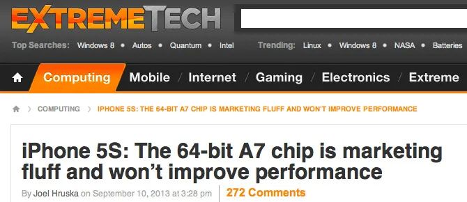 时任高通高级副总裁兼首席营销官 Anand Chandrasekher 表示,苹果的 64 位处理器就是在搞营销,消费者从中获益为零。外媒 ExtremeTech 表示,内存超过4GB的设备才可以展示出A7处理器的优势,当时的三星旗舰手机不过 3GB 内存,搭载 A7 的 iPhone 5S 更是只有 1GB 内存,因此 64 位应用并不值得。