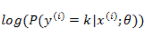 同样取负数把优化目标变为最小化,然后取 log ,得到代价函数: