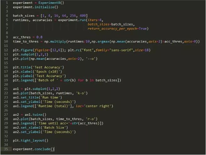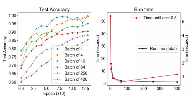结论:正如我们预期那样,运行时间确实随着批大小的增加而下降。然而,这导致了测试正确率的妥协,因为测试正确率随着批大小的增加而单调递减。