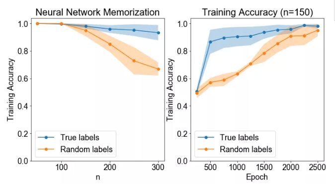 结论: 神经网络的记忆能力约为 150 个训练点。但即便如此,神经网络也需要更长的时间来学习随机标签,而不是真实值(ground truth)标签。