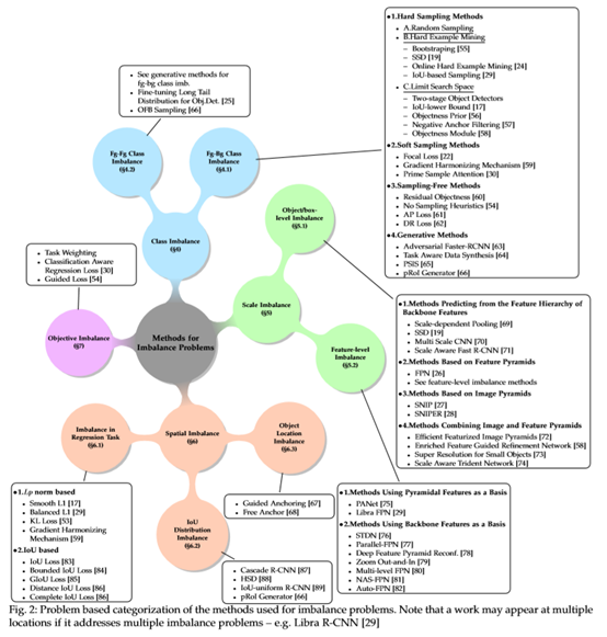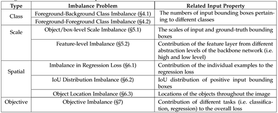 当与不同类别相关的示例数量之间存在显著的不平等时,就会出现类别不平衡。虽然这方面的经典例子是前景到背景的不平衡,但前景(正)类之间也存在不平衡。当对象具有不同的比例和属于不同比例的不同数量的示例时,就会出现比例不平衡。空间不平衡是指与bounding box的空间特性有关的一组因素,比如回归惩罚、定位和IoU相关。最后,当存在最小化多个损失函数时,会出现客观不平衡(各个损失函数的权重不均衡),这在OD中通常是如此(例如分类和回归损失)。