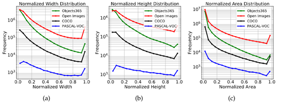 当对象或输入bounding box的某些大小在数据集中过度表示时,会发生尺度平衡。已经证明,这会影响总体检测性能。下图显示了MS-COCO数据集中对象的相对宽度、高度和面积;