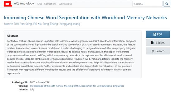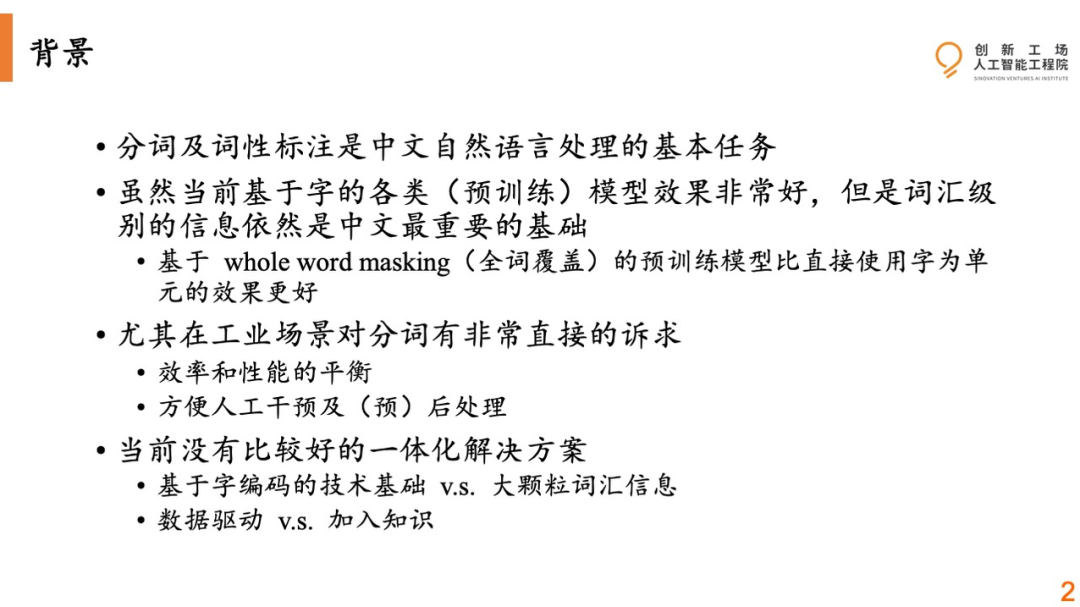 "Joint Chinese Word Segmentation and Part-of-speech Tagging via Two-way Attentions of Auto-analyzed Knowledge" 7 月 8 日上午,创新工场大湾区人工智能研究院执行院长宋彦针对这两篇入选论文进行了线上的分享解读。他指出,虽然现有的很多文字编码器,例如像贝尔模型,虽然你能大到很好的效果, 但是依然无法达到效果和性能的额平衡。尤其是在工业场景下,我们需要进行人工干预以及后续处理, 才能将一句话进行合理的 fenci 处理。